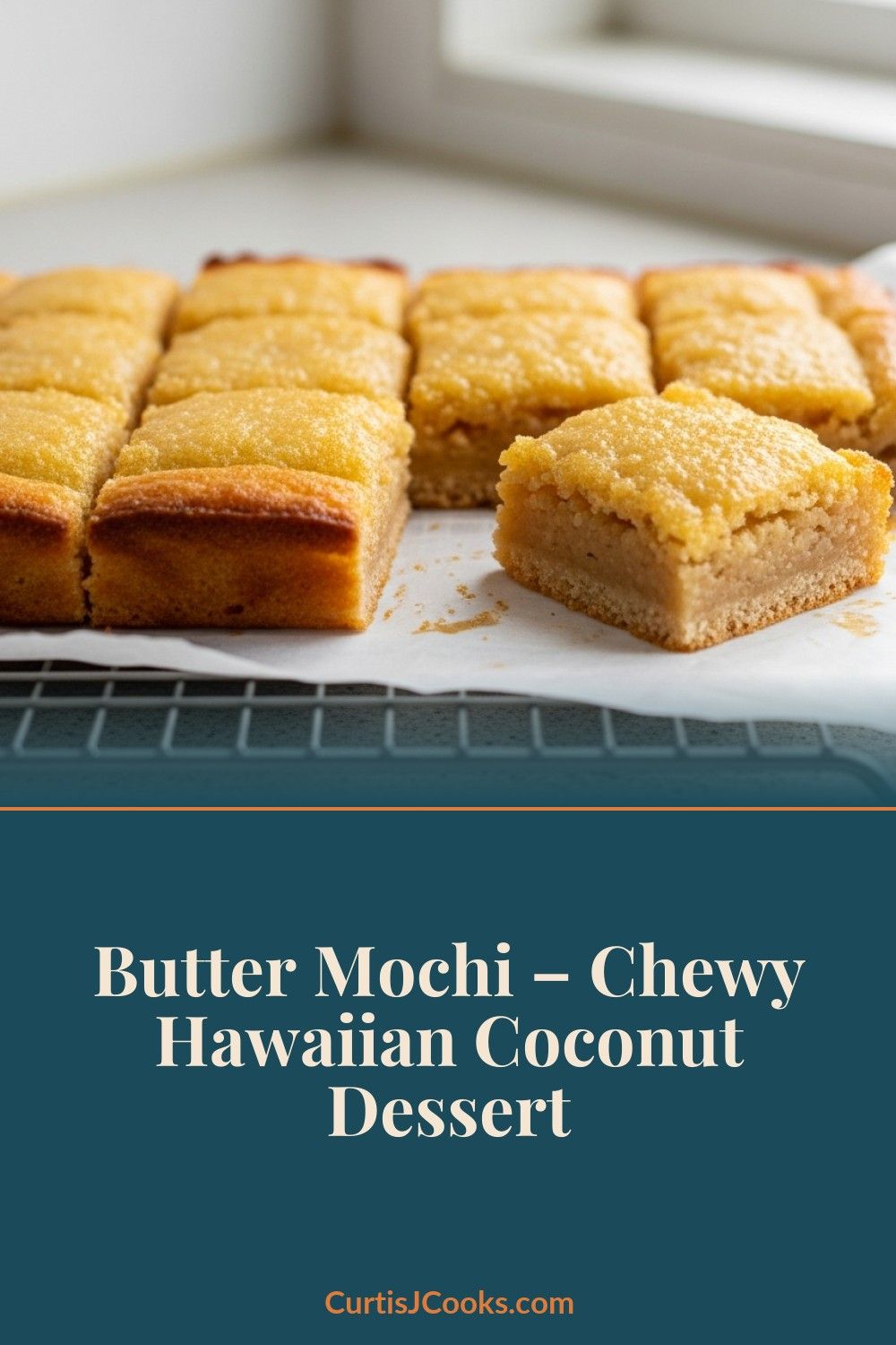 Butter mochi is the dessert that every newcomer to Hawaii discovers and immediately becomes obsessed with. It’s a simple baked bar — made from mochiko (sweet rice flour), butter, sugar, eggs, coconut milk, and vanilla — that comes out of the oven with a crispy golden top and a soft, impossibly chewy interior. The texture is unlike any other baked good you’ve ever had. It’s not cake, it’s not brownie, it’s not custard. It’s mochi — dense, chewy, slightly sticky, and completely addictive.