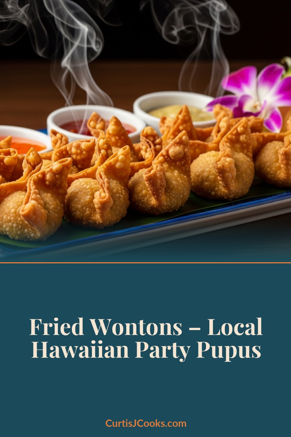 Crispy fried wontons piled on a plate with sweet chili dipping sauce and hot mustard, garnished with green onions in a Hawaiian party pupu presentation