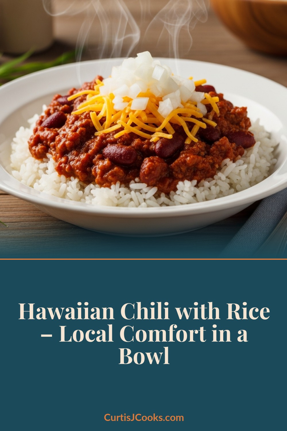 Let me tell you something about Hawaiian chili: if someone puts a bowl of it in front of you with crackers on the side, they’re not from here. In Hawaii, chili goes over rice. Always. That’s not negotiable. A big scoop of hot white rice in the bottom of the bowl, thick chili ladled on top, buried under a mountain of grated cheddar cheese and a handful of diced raw onion. That’s how we do it, and that’s how it’s been done at every diner, school cafeteria, and family kitchen across the islands for as long as anyone can remember.
