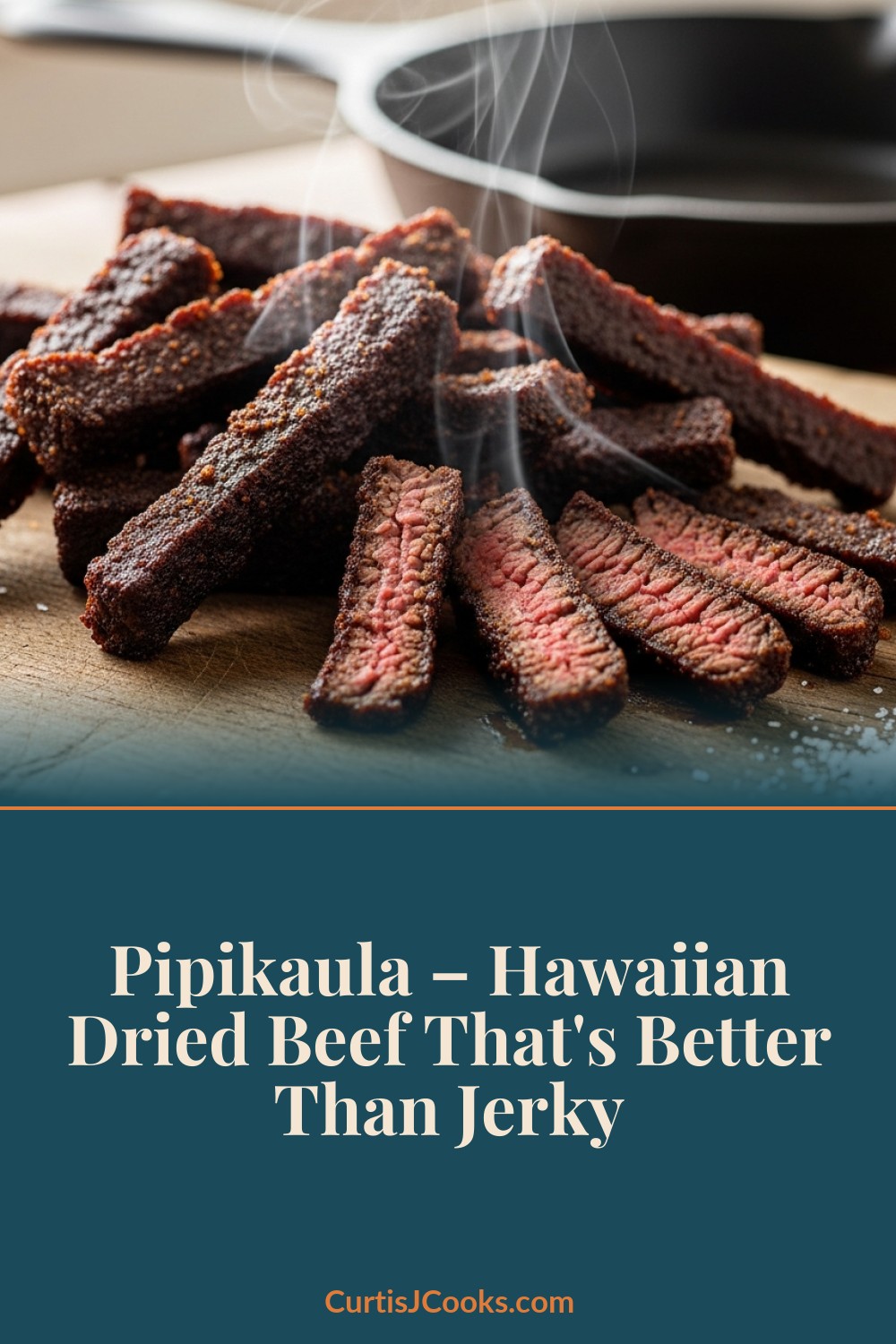 If you’ve never had pipikaula, you’re missing one of the most underrated dishes in all of Hawaiian cuisine. It’s Hawaiian-style dried beef — salted, seasoned, sun-dried (or oven-dried), and then pan-fried until the outside is crispy and the inside is chewy and intensely flavorful. Think of it as Hawaii’s answer to beef jerky, except it’s a million times better because you fry it after drying it, which gives you this incredible contrast of textures: crunchy, salty exterior and tender, concentrated beefy interior.